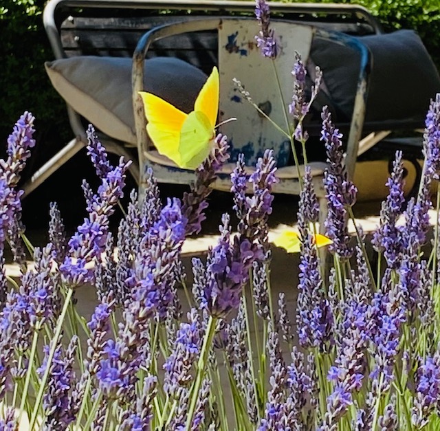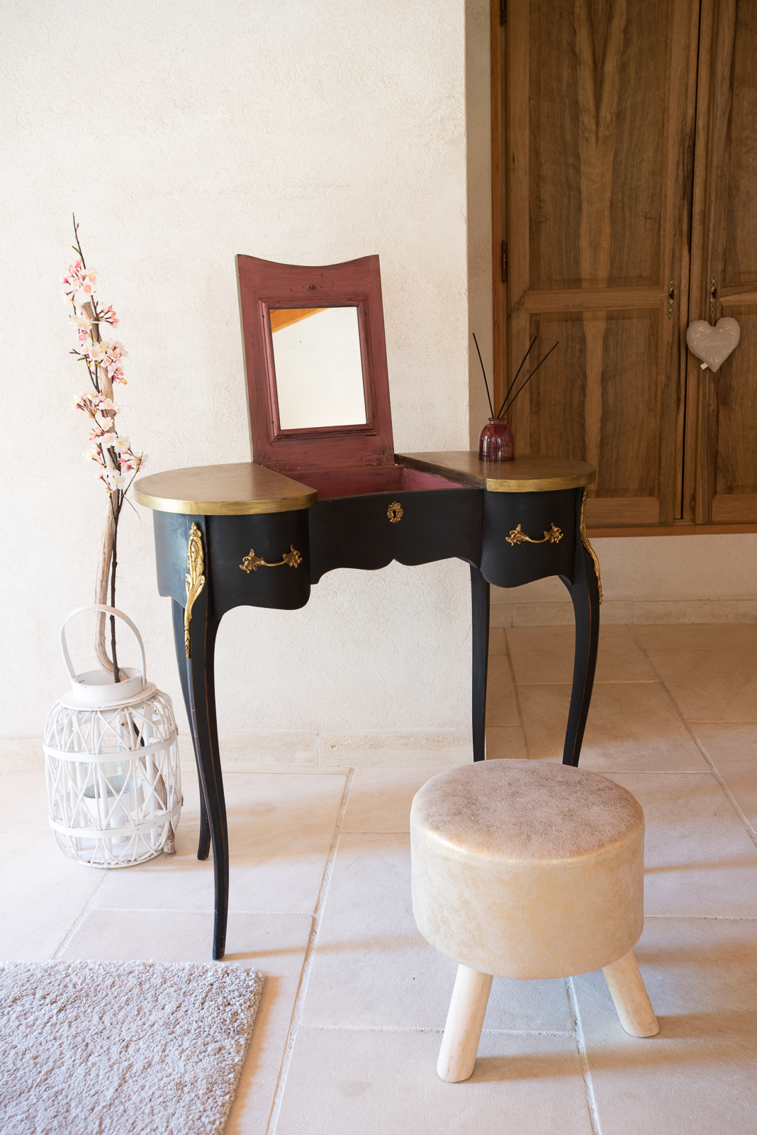 Ein Gästezimmer im authentischen und romantischen Stil mit Holzbalken und ein Steinboden. Die private Terrasse bietet einen weiten Blick auf den Garten und den Luberon.
